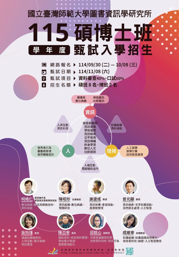 本校圖資所115學年度碩士班甄試入學招生簡章公告 ●報名期間:114年9月30日(星期二) ~ 114年10月8日(星期三),一律採網路報名,並上傳審查資料。●准考證列印:114年10月23日(星期四)~ 114年11月9日(星期日),由考生自行於網路列印。●碩士班名額:8名。碩士班甄試簡章點此開啟 Post author:upls Post published:2025-09-19